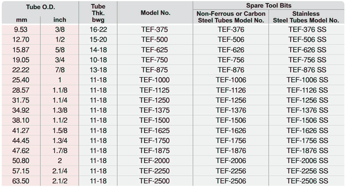 One size of tool is suitable for use on multiple tube thicknesses by interchanging pilot. (TEF-375 is the exception with the tool suitable for one tube ID only).